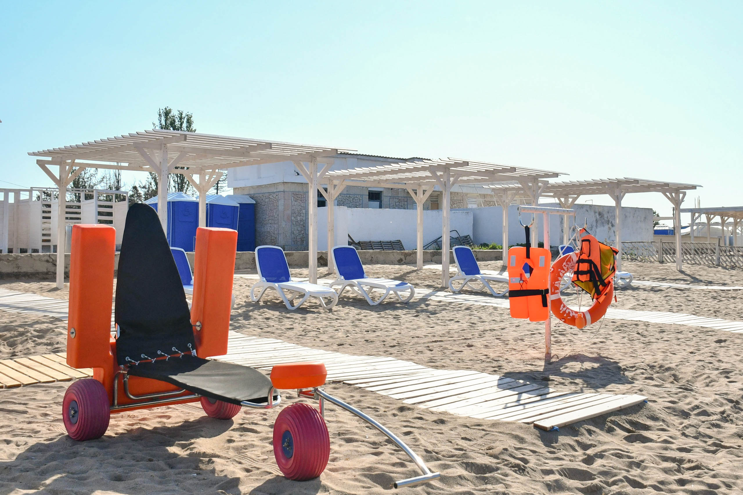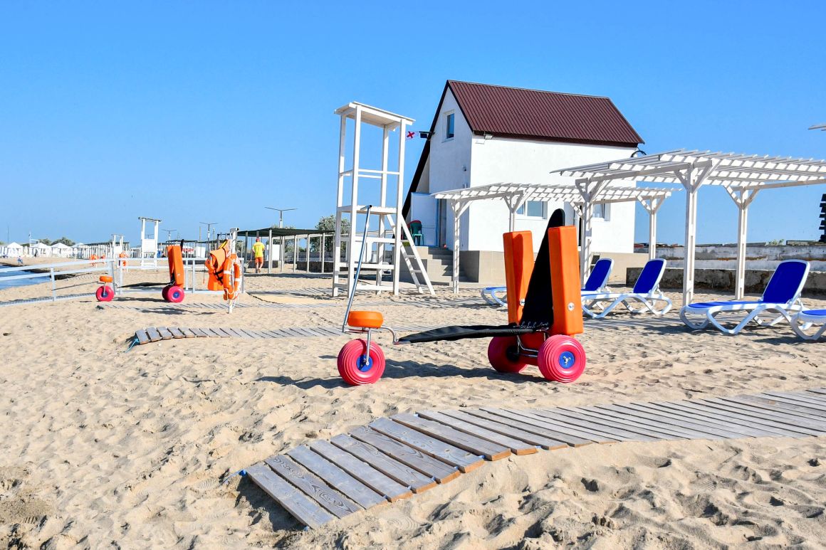 Пляж адаптирован для маломобильной группы населения и оснащен пандусами, спуском в воду, широкими дорожками, специализированными колясками для купания людей с ОВЗ.