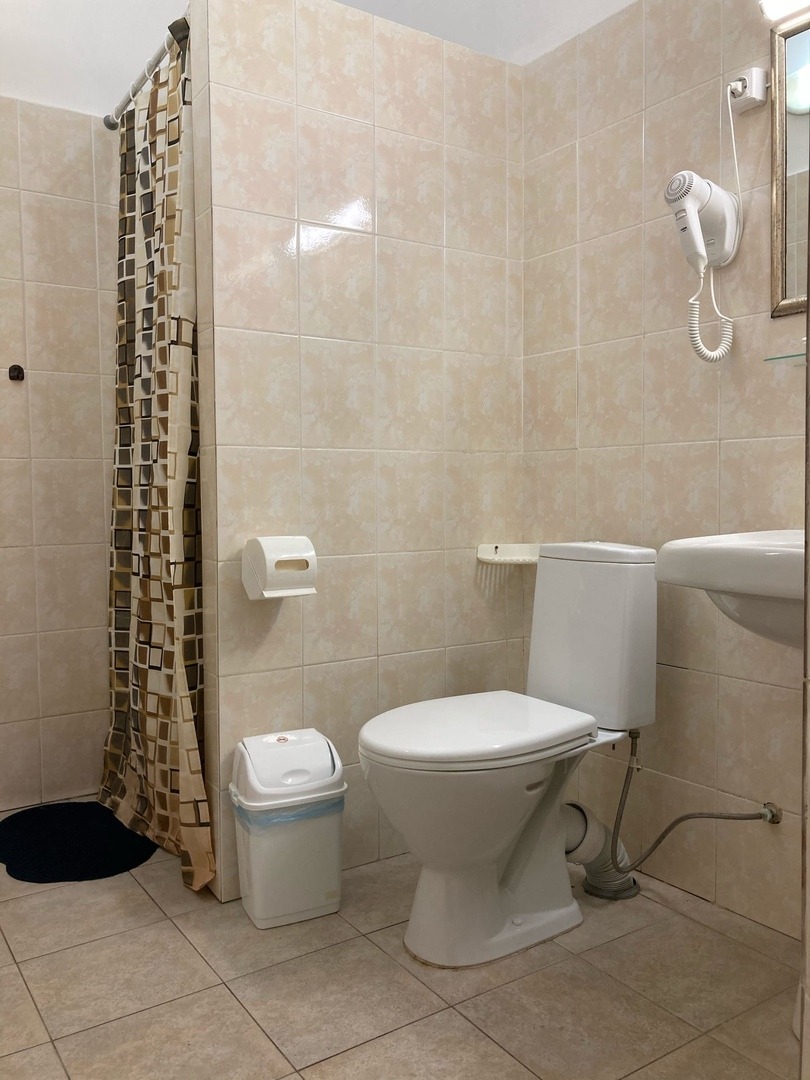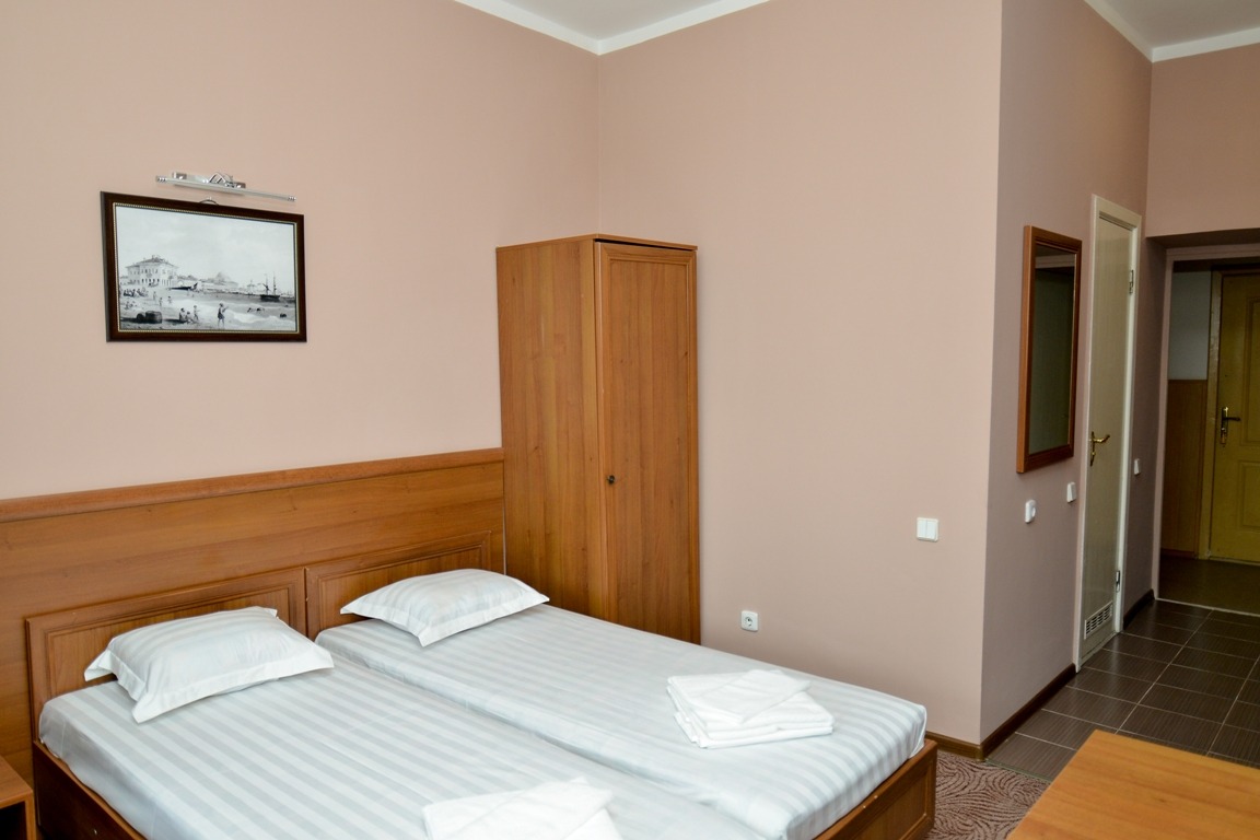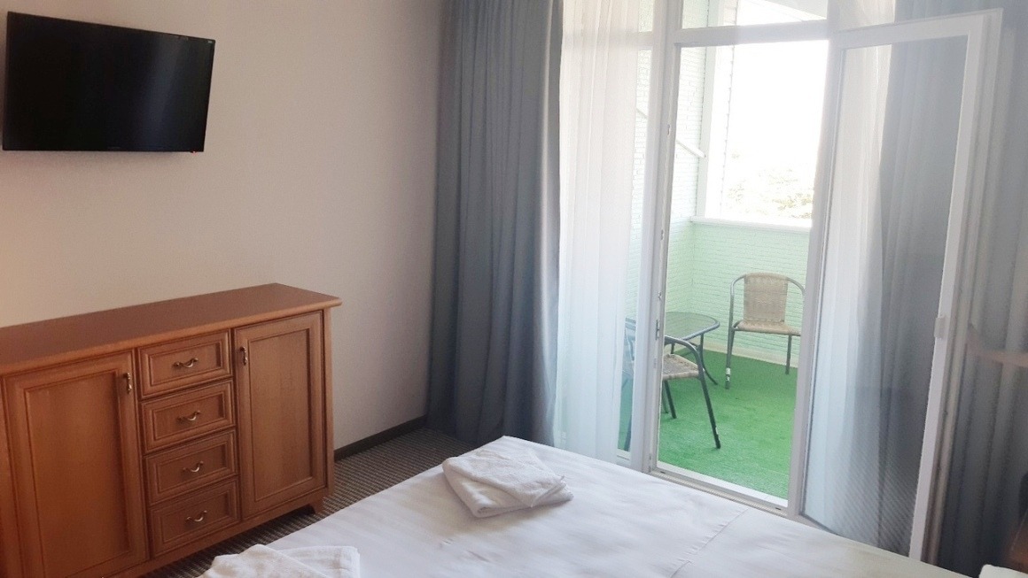 площадь номера 15 кв.м. (телевизор, холодильник, кондиционер, две кровати, шкаф, столик со стульями, 2 прикроватные тумбочки, зеркало, комод. При входе стоит тумбочка для обуви, вешалка. Санузел с душем, туалетом, раковиной для умывания. В номере имеется балкон или лоджия).