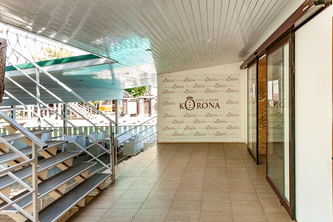 Пансионат "Корона"  -  расположен в центре курортной части Евпатории, в небольшом уютном парке, на расстоянии 500 м от моря. Маршрут к морю пролегает по центральной курортной парковой зоне. Возле комплекса находится центральный парк с множеством баров, ресторанов, аттракционов, дискотек, недалеко расположен дельфинарий, аквариум, аквапарк и кинотеатр.