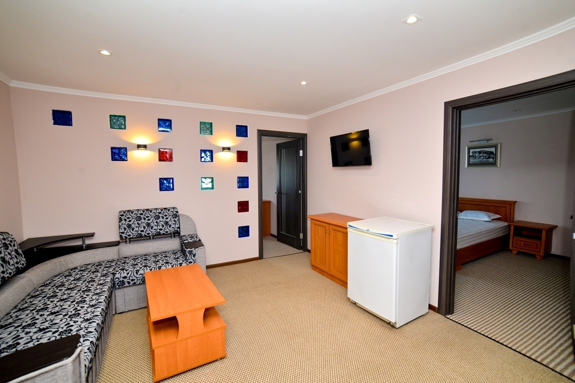 площадь номера 45 кв.м. (номер включает гостиную и две спальные комнаты. Гостиная: раскладывающийся диван, журнальный столик, комод, телевизор, холодильник, электроприборы, угловой сервант. Спальная комната 1: двуспальная кровать, две прикроватные тумбочки, шкаф, комод, телевизор, кондиционер. Спальная комната 2: две односпальные кровати, две прикроватные тумбочки, комод, кондиционер. Два санузла (один: с душевой, туалетом, раковиной для умывания. Второй: с туалетом и раковиной для умывания). В номере балкон с мебелью.