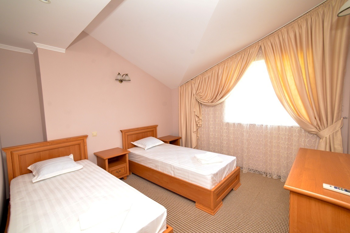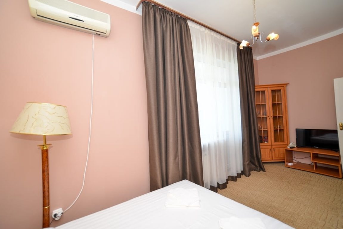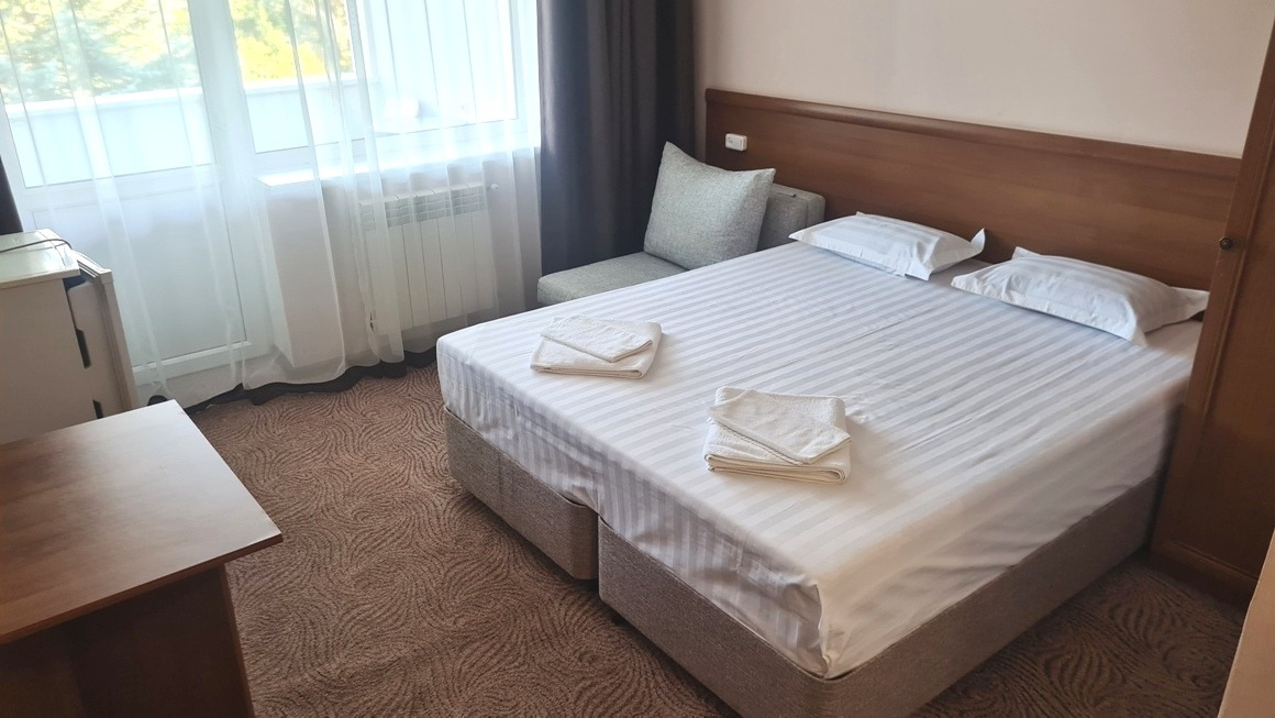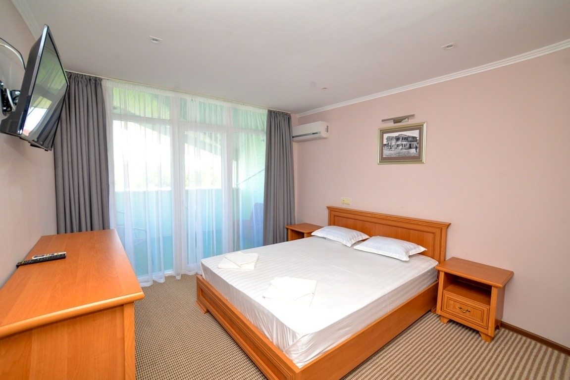 (1-комнатный номер оснащен двуспальной кроватью, 2 прикроватные тумбочки, столик, диван, угловая витрина, торшер, платяной шкаф, телевизор, холодильник, кондиционер, телефон, электробытовые приборы. Ванная комната, туалет, раковина для умывания).