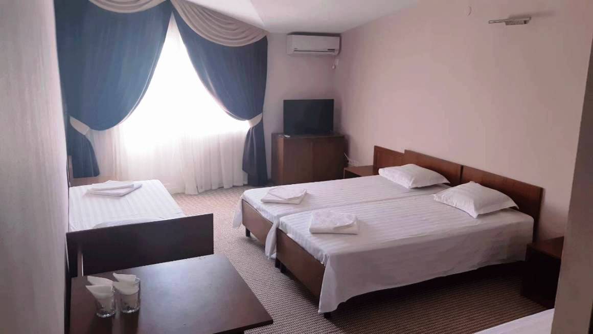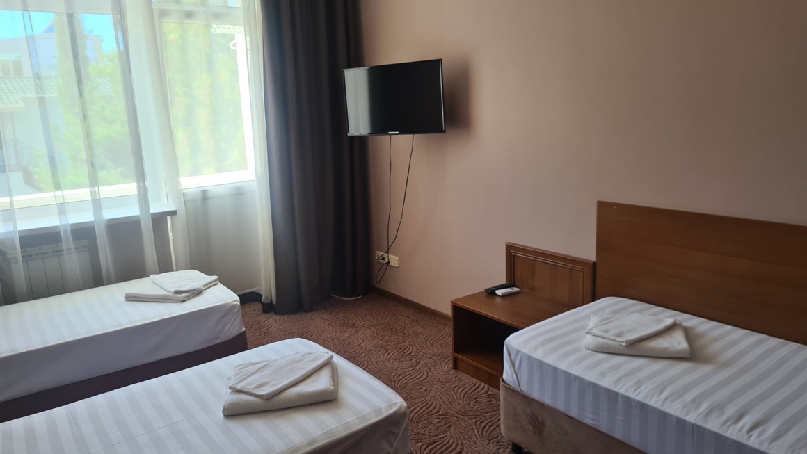 площадь номера 25 кв.м. (номер находится на 4-м этаже. Четыре односпальных кровати, прикроватные тумбочки, комод, шкаф, журнальный столик со стульями, телевизор, холодильник, кондиционер. При входе стоит тумбочка для обуви, вешалка. Санузел с душем, туалетом, раковиной для умывания. В номере имеется балкон или лоджия).
