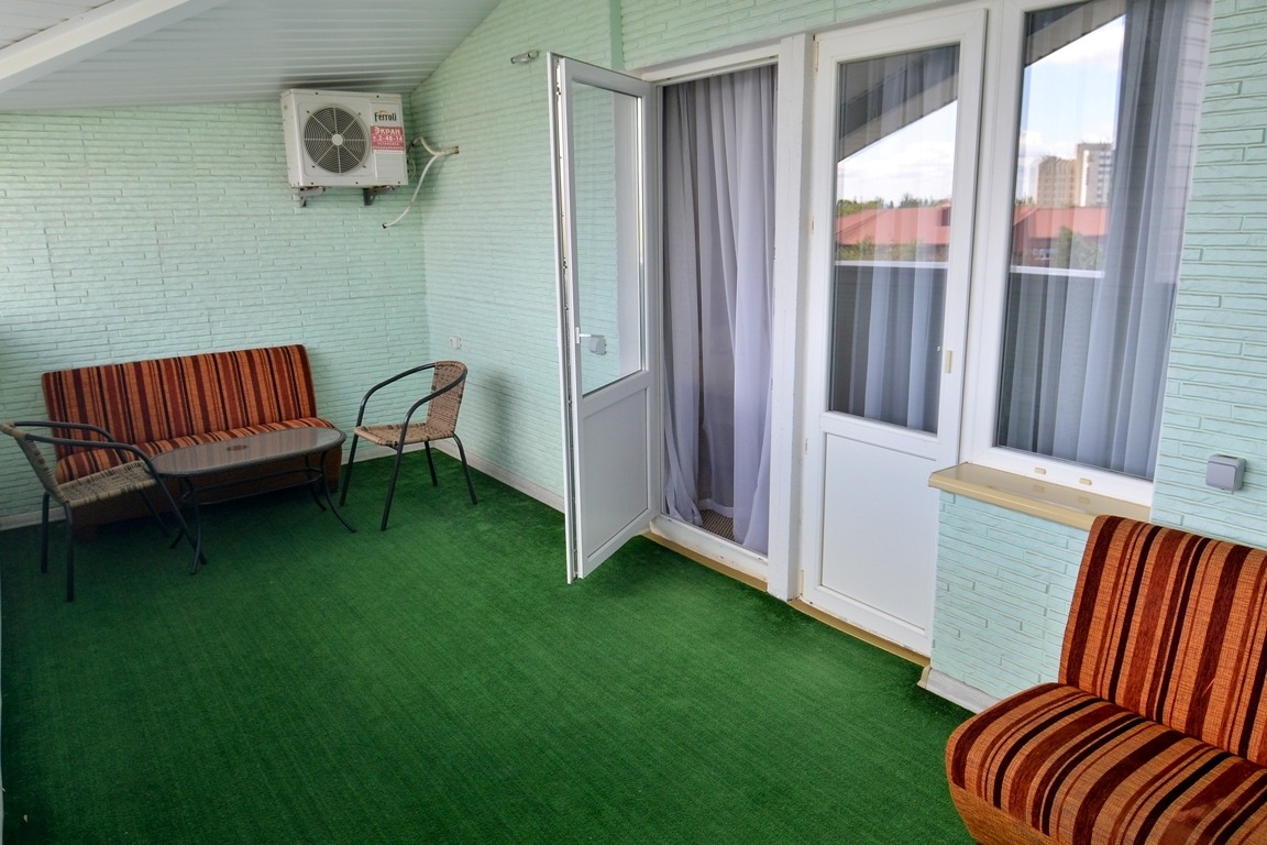 площадь номера 17 кв.м. (телевизор, холодильник, кондиционер, три кровати, шкаф, столик со стульями, 3 прикроватные тумбочки, зеркало, комод. При входе стоит тумбочка для обуви, вешалка. Санузел с душем, туалетом, раковиной для умывания. В номере имеется балкон или лоджия).