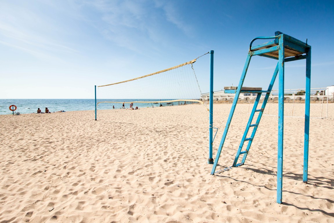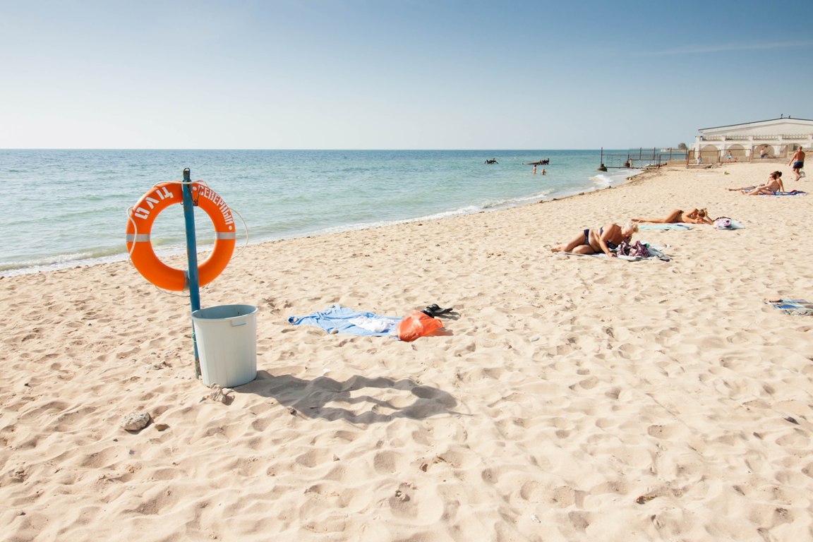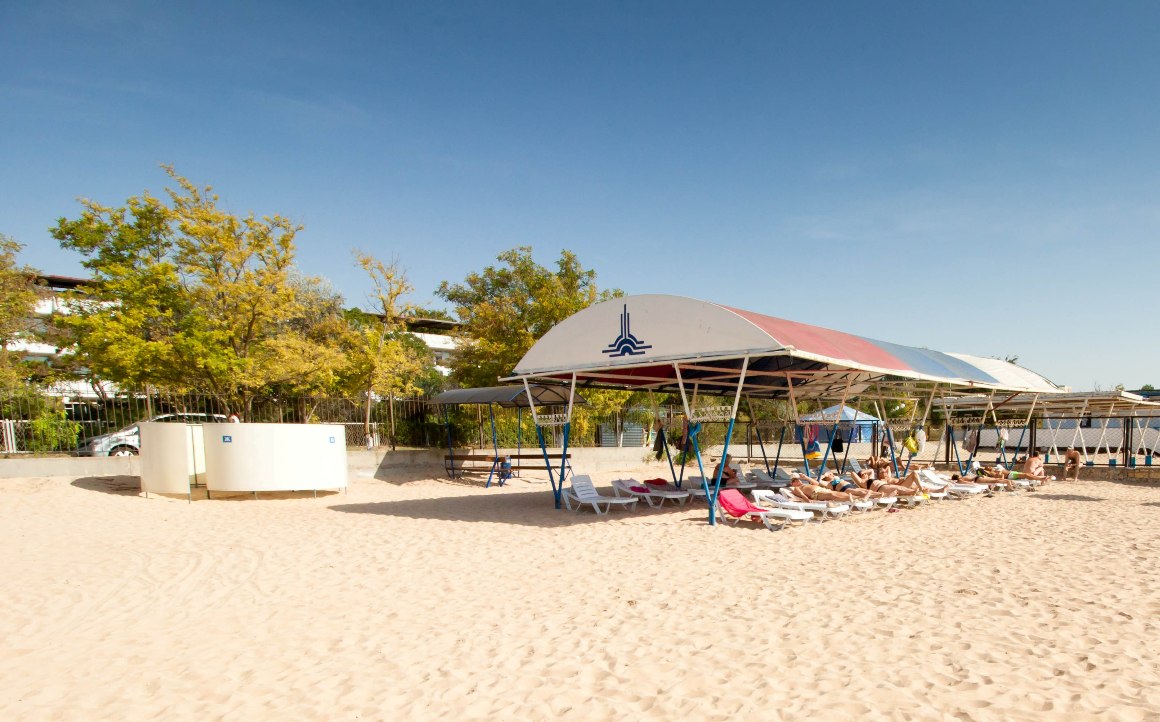 Песчаный, собственный, в 450 метрах от основной территории. Комфортное пребывание на пляже обеспечивают теневые навесы, раздевалки, душевые, питьевые фонтанчики и туалет. Чистота песка достигается с применением пляжеуборочной машины. Организована спасательная служба, есть медицинский павильон, пункт проката пляжного инвентаря, площадка для проведения соревнований по пляжному волейболу, работает бар.