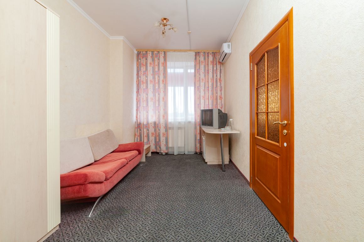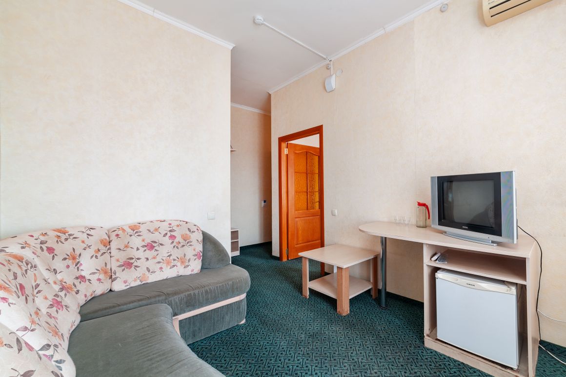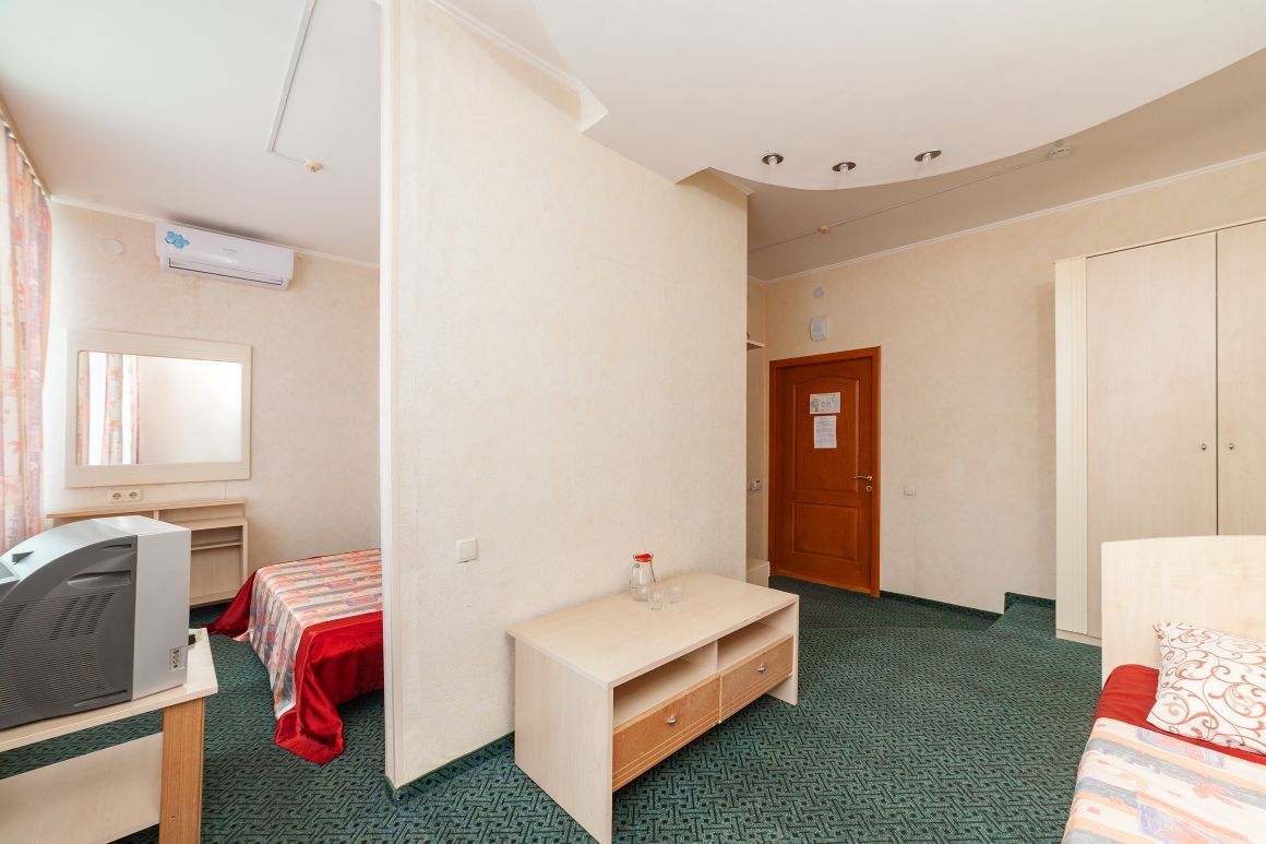 В номере: сан.узел (умывальник, туалет, душевая кабинка), стол, шкаф для одежды с вешалками, телевизор, холодильник, кондиционер; кресло или стулья, кровати, диван, прикроватные тумбы, графин со стаканами. Дополнительное место – предусмотрено до двух дополнительных мест (кресло или евро-раскладушка). Все номера отличаются друг от друга (площадью, интерьером, наличием межкомнатных дверей).