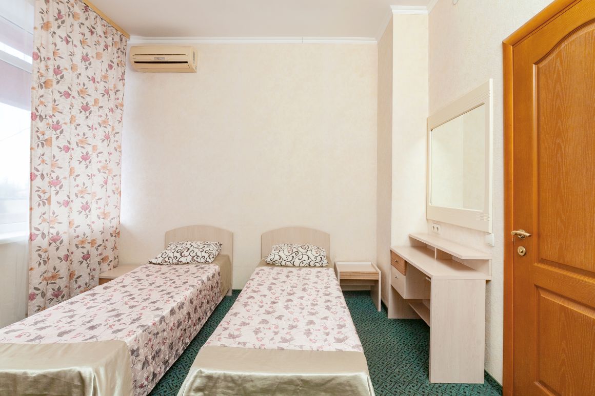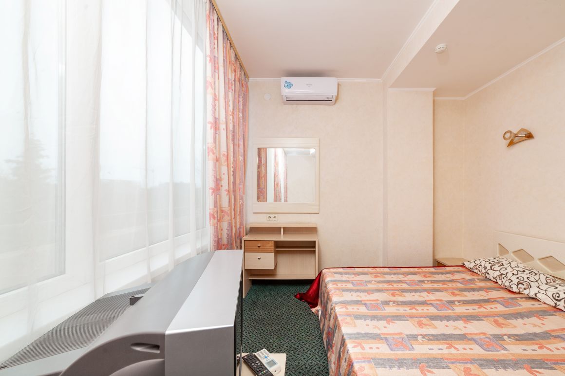 В номере: сан.узел (умывальник, туалет, душевая кабинка), стол, шкаф для одежды с вешалками, телевизор, холодильник, кондиционер; кресло или стулья, кровати, прикроватные тумбы, графин со стаканами. Дополнительное место – не предусмотрено. Все номера отличаются друг от друга (площадью, интерьером)