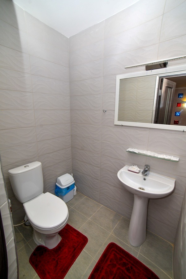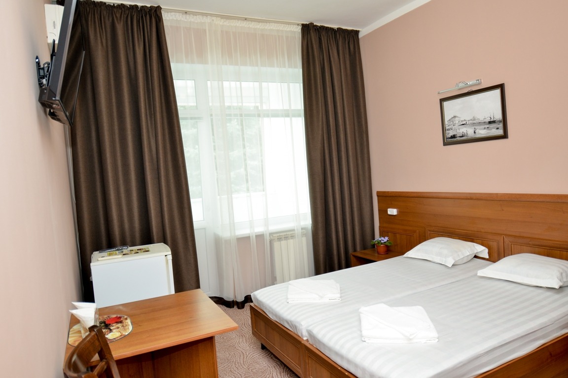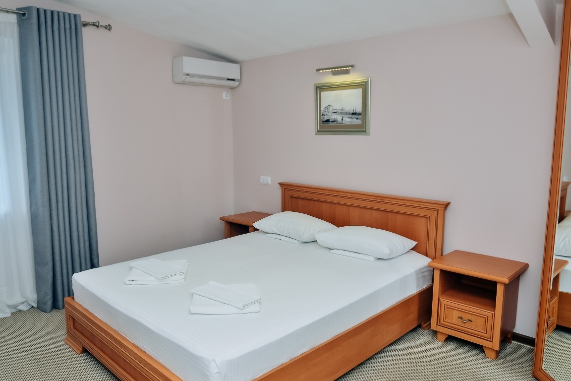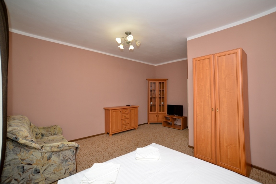(1-комнатный номер оснащен двуспальной кроватью, 2 прикроватные тумбочки, столик, диван, угловая витрина, торшер, платяной шкаф, телевизор, холодильник, кондиционер, телефон, электробытовые приборы. Ванная комната, туалет, раковина для умывания).
