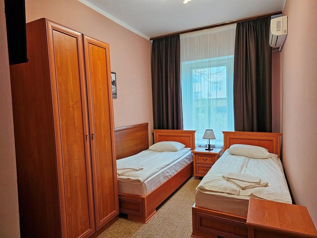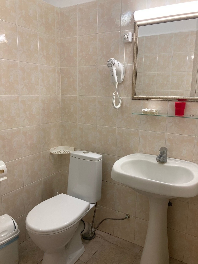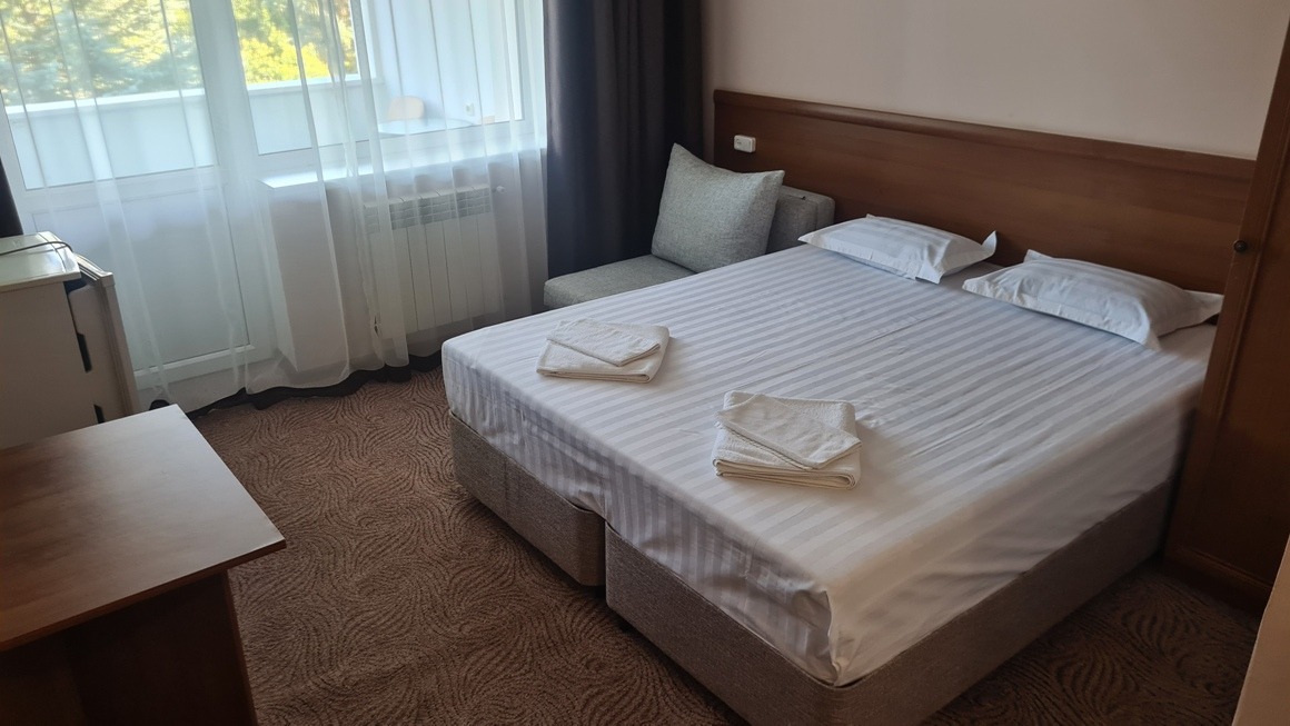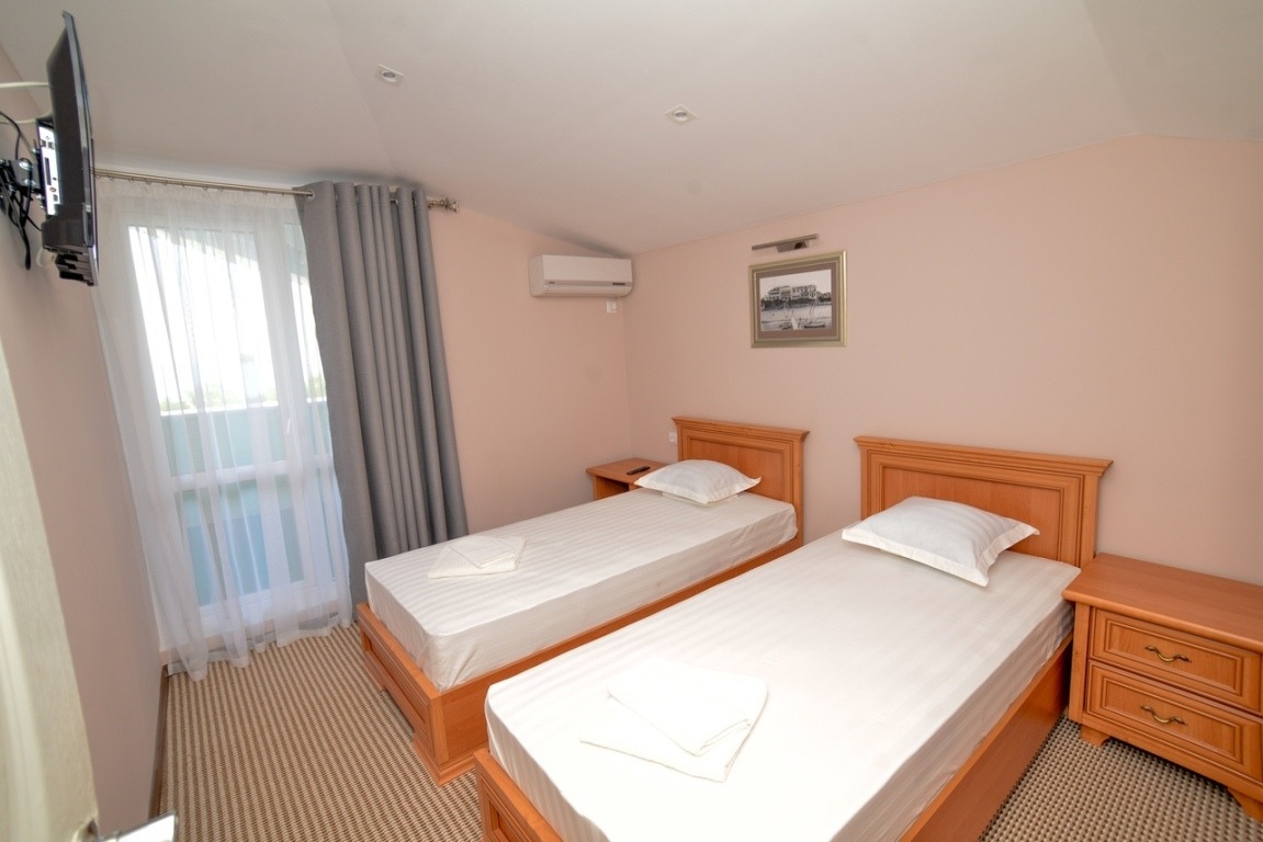 площадь номера 15 кв.м. (телевизор, холодильник, кондиционер, две кровати, шкаф, столик со стульями, 2 прикроватные тумбочки, зеркало, комод. При входе стоит тумбочка для обуви, вешалка. Санузел с душем, туалетом, раковиной для умывания. В номере имеется балкон или лоджия).