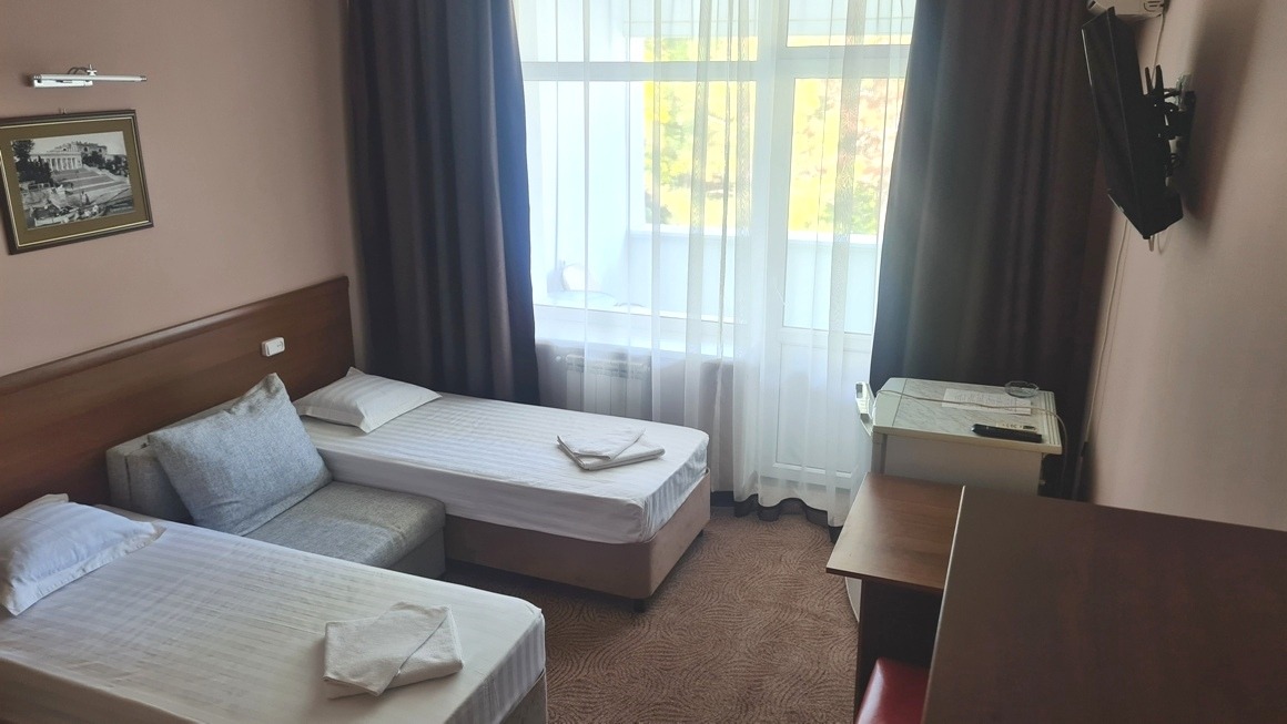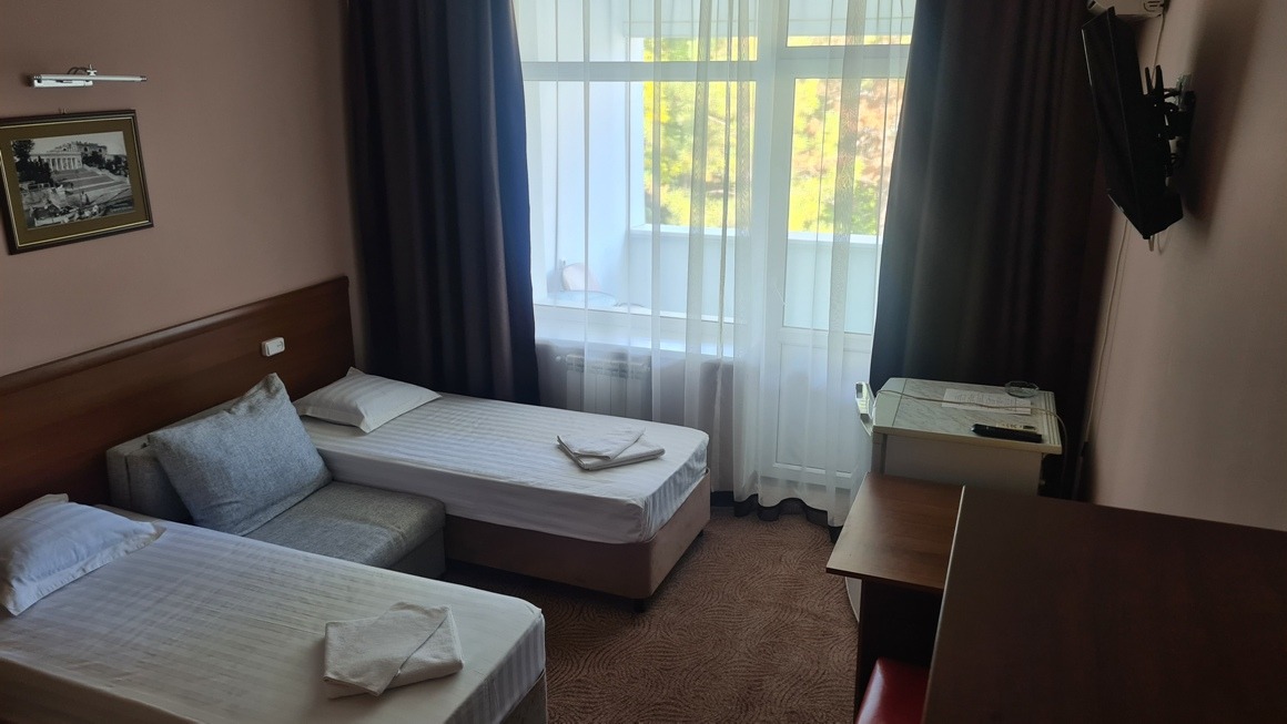 площадь номера 25 кв.м. (номер находится на 4-м этаже. Четыре односпальных кровати, прикроватные тумбочки, комод, шкаф, журнальный столик со стульями, телевизор, холодильник, кондиционер. При входе стоит тумбочка для обуви, вешалка. Санузел с душем, туалетом, раковиной для умывания. В номере имеется балкон или лоджия).