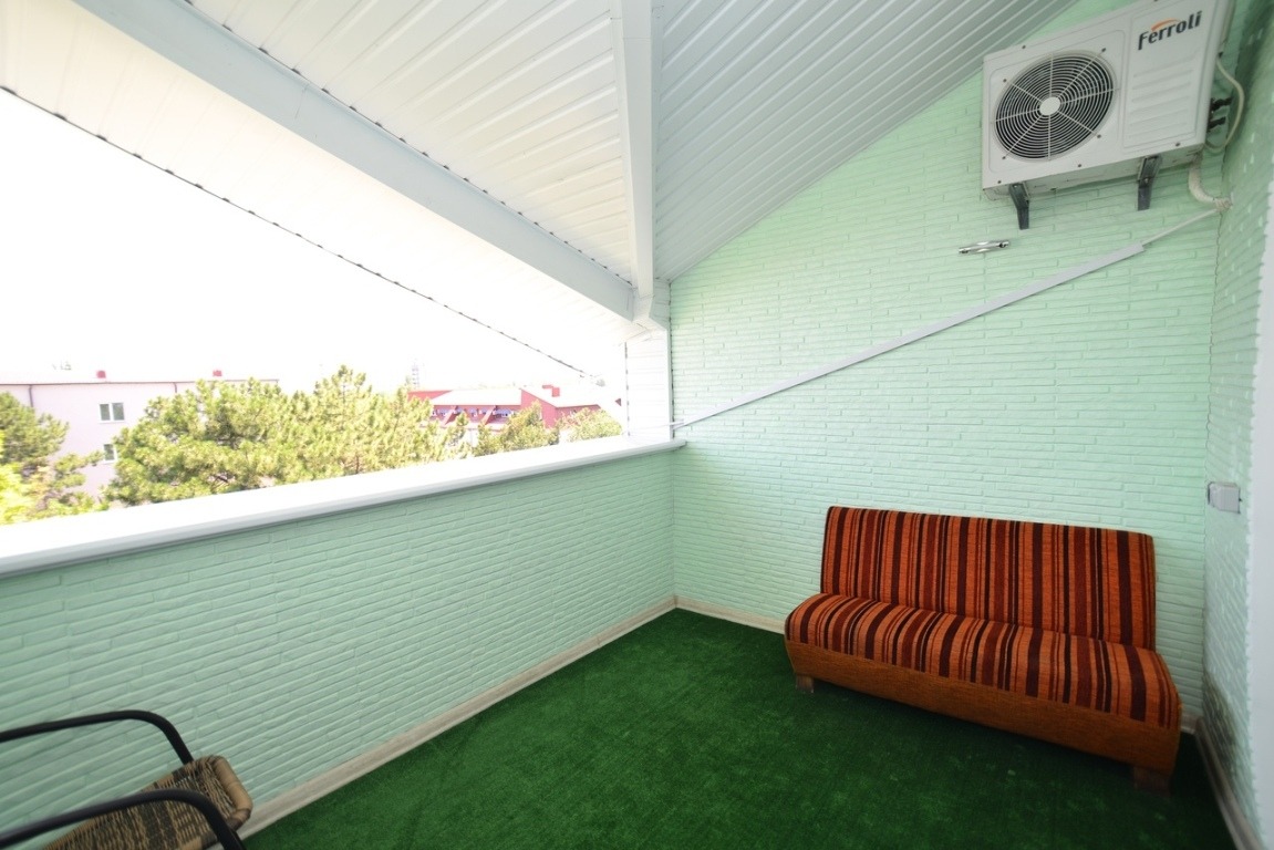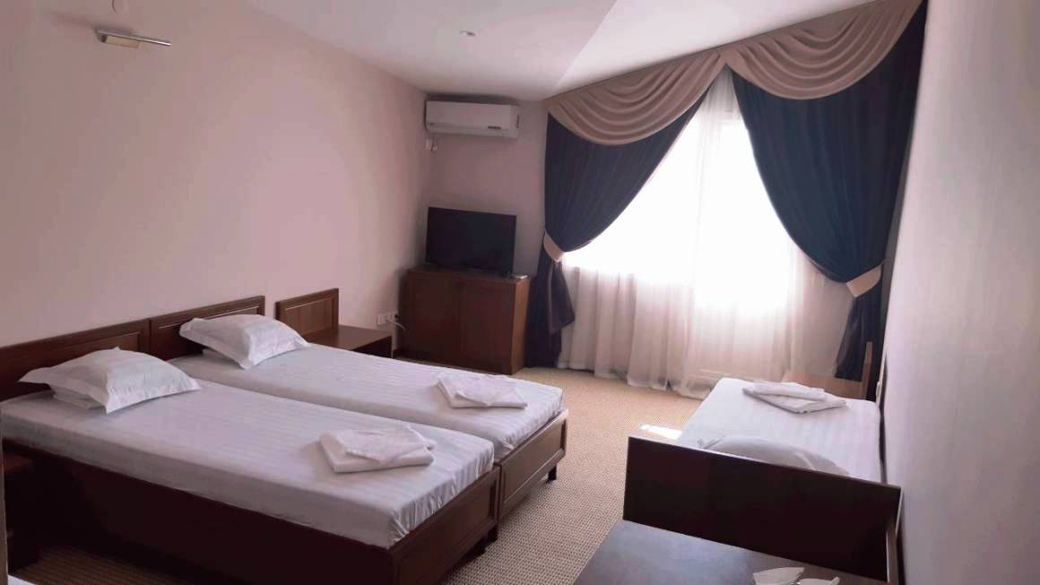 площадь номера 17 кв.м. (телевизор, холодильник, кондиционер, три кровати, шкаф, столик со стульями, 3 прикроватные тумбочки, зеркало, комод. При входе стоит тумбочка для обуви, вешалка. Санузел с душем, туалетом, раковиной для умывания. В номере имеется балкон или лоджия).