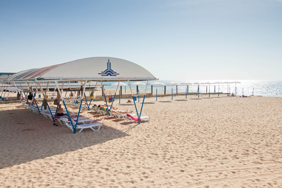 Песчаный, собственный, в 450 метрах от основной территории. Комфортное пребывание на пляже обеспечивают теневые навесы, раздевалки, душевые, питьевые фонтанчики и туалет. Чистота песка достигается с применением пляжеуборочной машины. Организована спасательная служба, есть медицинский павильон, пункт проката пляжного инвентаря, площадка для проведения соревнований по пляжному волейболу, работает бар.